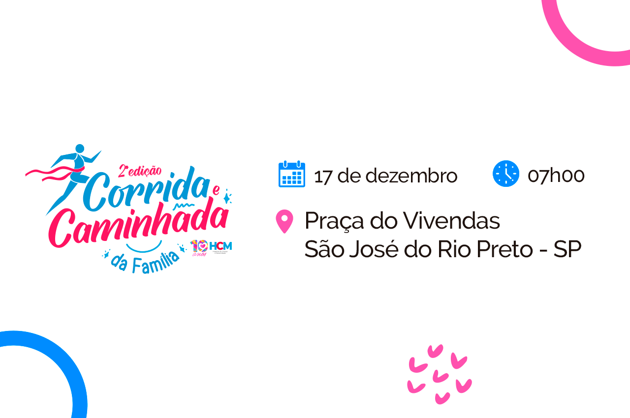 Estão abertas as inscrições para a 2ª edição da corrida e caminhada da família do Hospital da Criança e Maternidade (HCM). A prova acontecerá no dia 17 de dezembro, a partir das 7h, na Praça José Gerosa, popularmente conhecida como Praça do Vivendas, em São José do Rio Preto/SP. O objetivo do evento é arrecadar fundos para a instituição. O evento encerra as comemorações dos 10 anos do HCM.